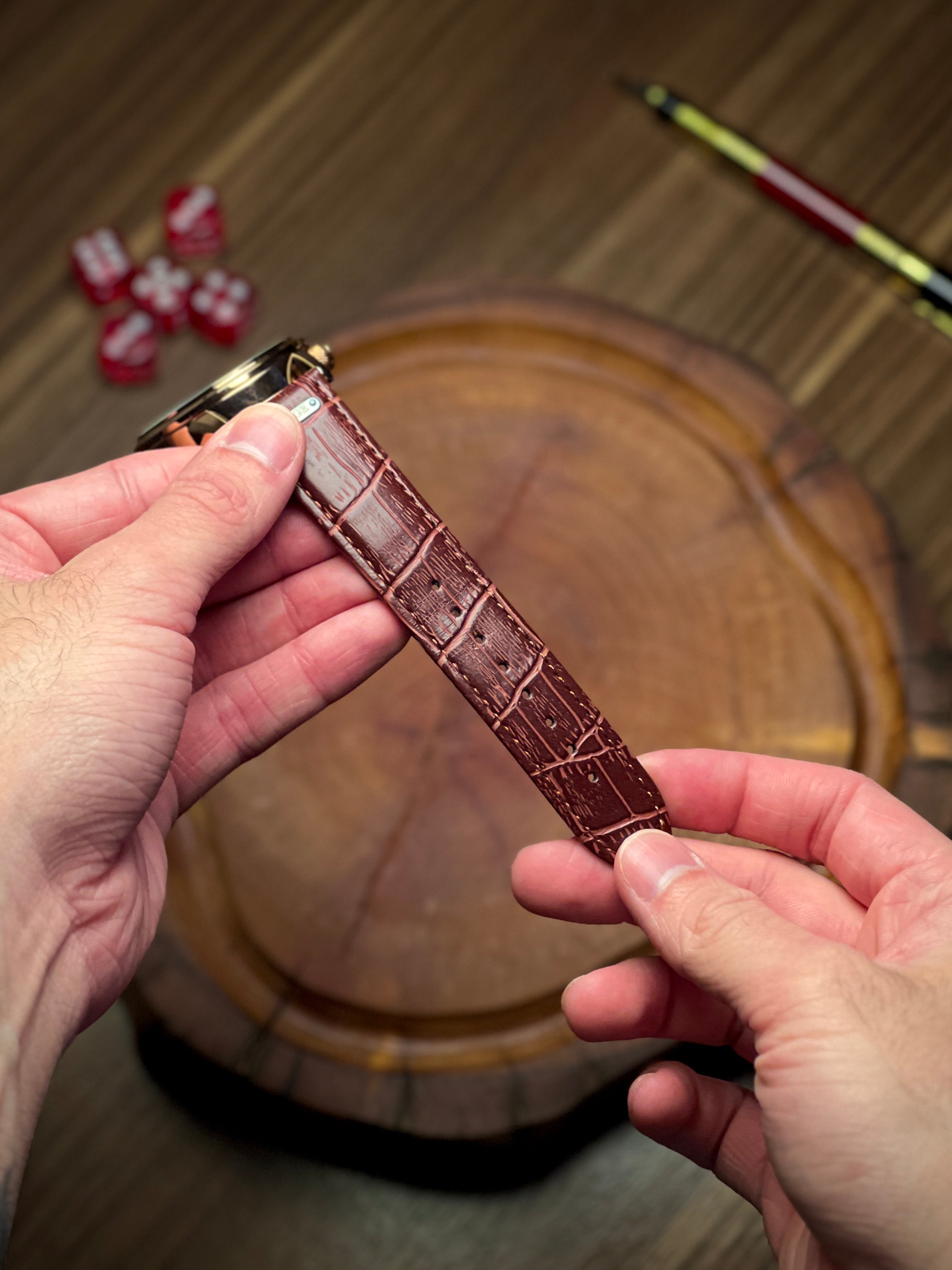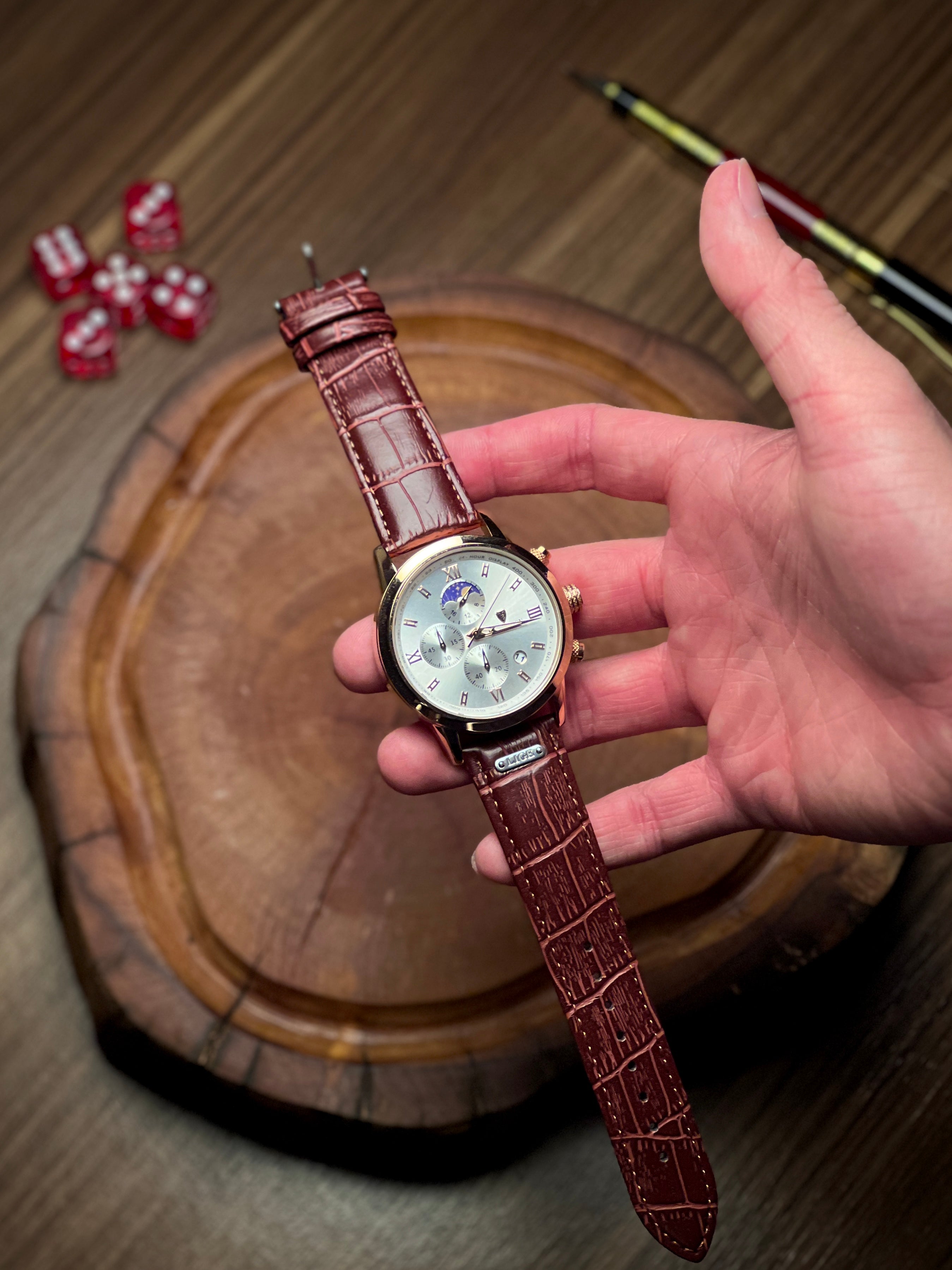 A caixa em aço inoxidável 316L oferece resistência superior e acabamento impecável, enquanto a pulseira em couro legítimo proporciona conforto, textura refinada e uma adaptação natural ao pulso ao longo do tempo.